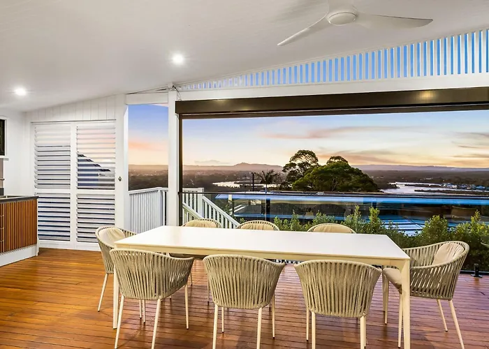 Die Villa Sunset Lagoon Noosa Luxury With Stunning Views bezaubert Gäste mit einem Blick auf den Fluss. Diese Unterkunft verfügt über ein Badezimmer mit einem Bidet und einer Waschmaschine. Ein Haartrockner werden auch angeboten.